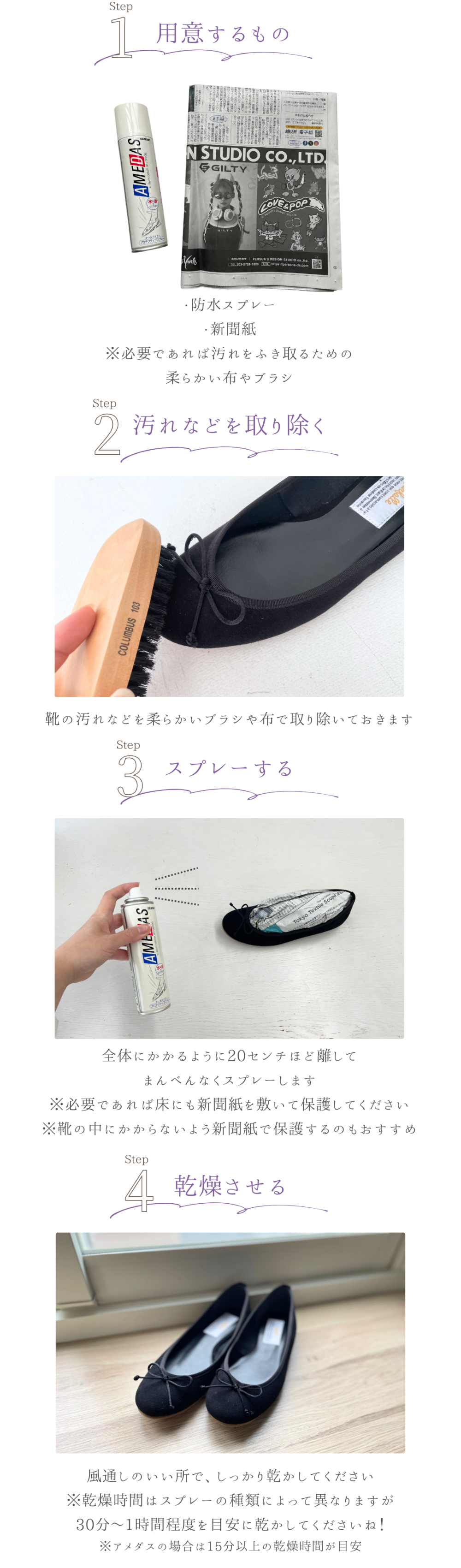 ファルファーレのシューズで撥水バレエシリーズや、スエード調素材などもともと撥水加工が施されている素材は、効果が薄れてきたなと感じたら、改めて使用してください。