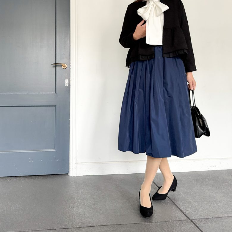 足元にはスエード調素材のブラックパンプスでシックにまとめて。