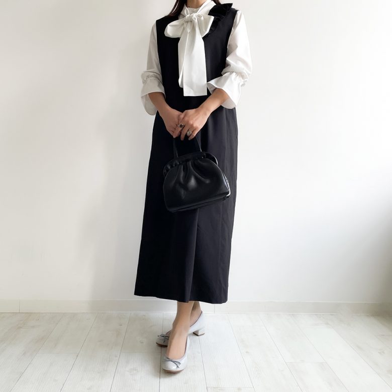 ブラックやネイビーなど、落ち着いた印象のカラーのスタイリングがおすすめ。