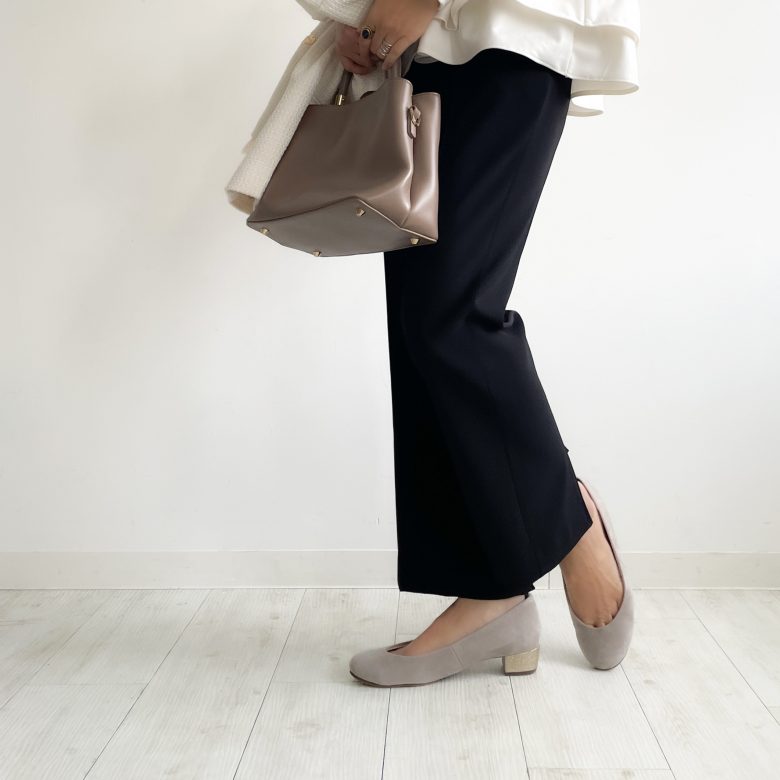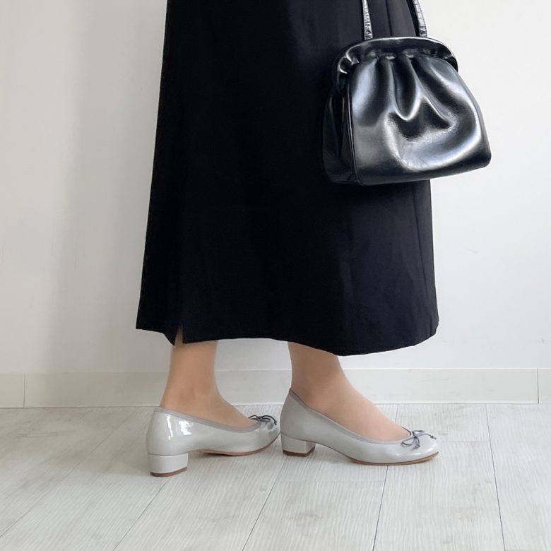 愛らしいフォルムのバレエシューズも3cmヒールならきちんとした印象の足元に。