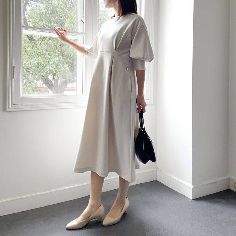 滑らかでとろみのある素材が品よくコーディネートをまとめて、ふんわりボリューム感のある袖が華やかさをプラス。