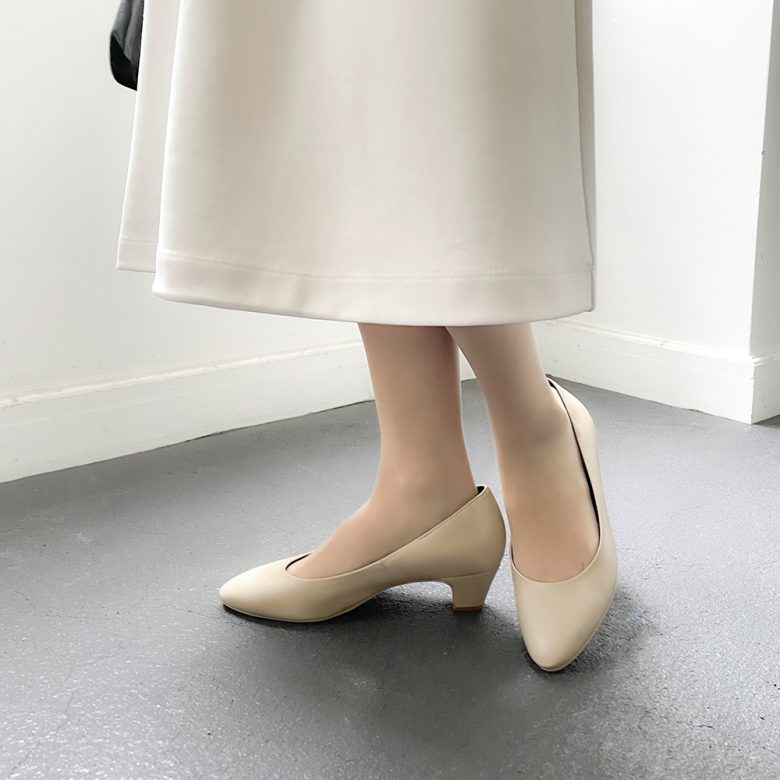 肌馴染みのいいぺージュのプレーンパンプスは、明るく華やかなパステルカラーや淡いトーンのお洋服と好相性。