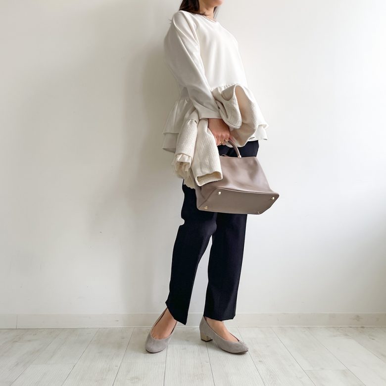 裾がフリルのように広がったペプラムトップスに、グリッターヒールのパンプスと、細部におしゃれ心の効いたデザインをあしらったアイテムでアクセントをプラス。