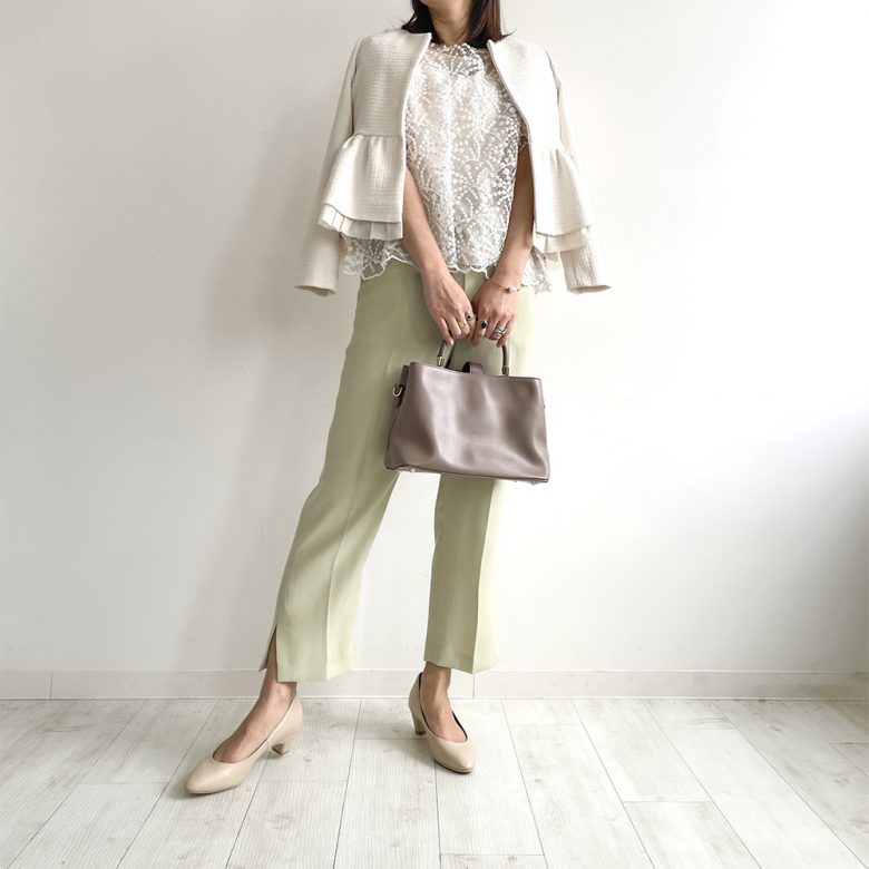 入学式など、ぱっと晴れやかな春の日は、ホワイトやベージュ、ペールトーンなど、明るいニュアンスカラーでまとめるのがおすすめ。