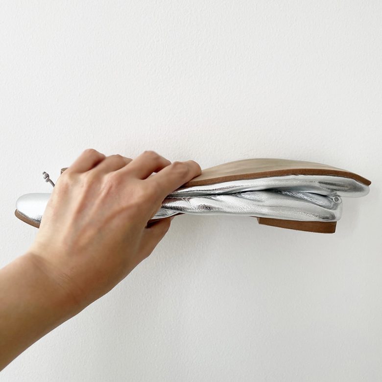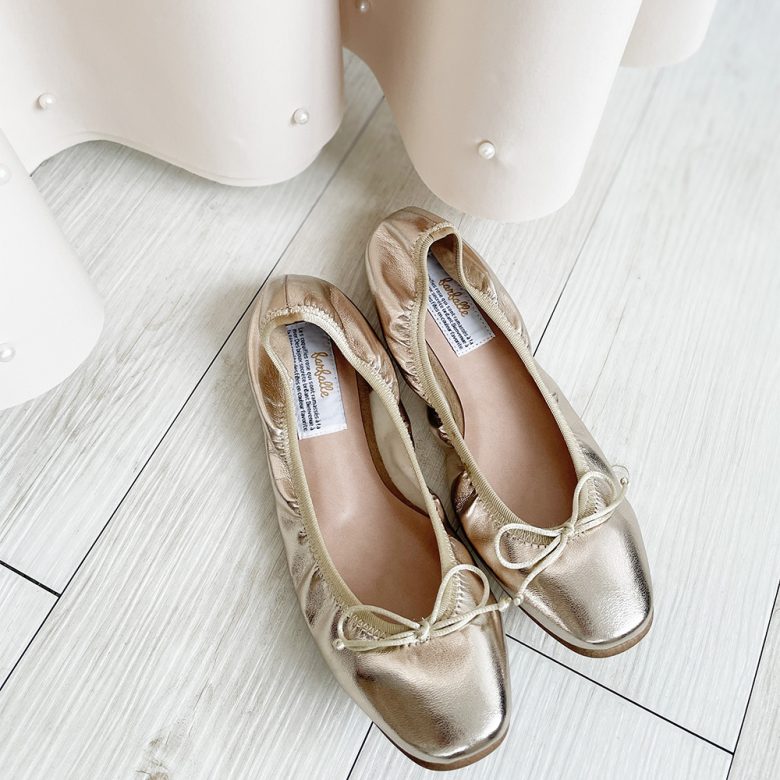 そんな時は、軽くて持ち運ぶときもかさばらない、履き口ギャザーのスクエアトゥバレエシューズが便利◎
