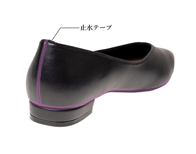 撥水性や防水性のある生地(人工皮革・合成皮革)と、かかとの縫い目や靴底と甲皮の境目に止水テープを仕込んでいるので雨の日も安心です。