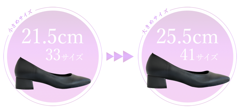 33(21.5cm)から41サイズ(25.5cm)まで5ミリ刻みの9サイズ展開でぴったりサイズが選べます。