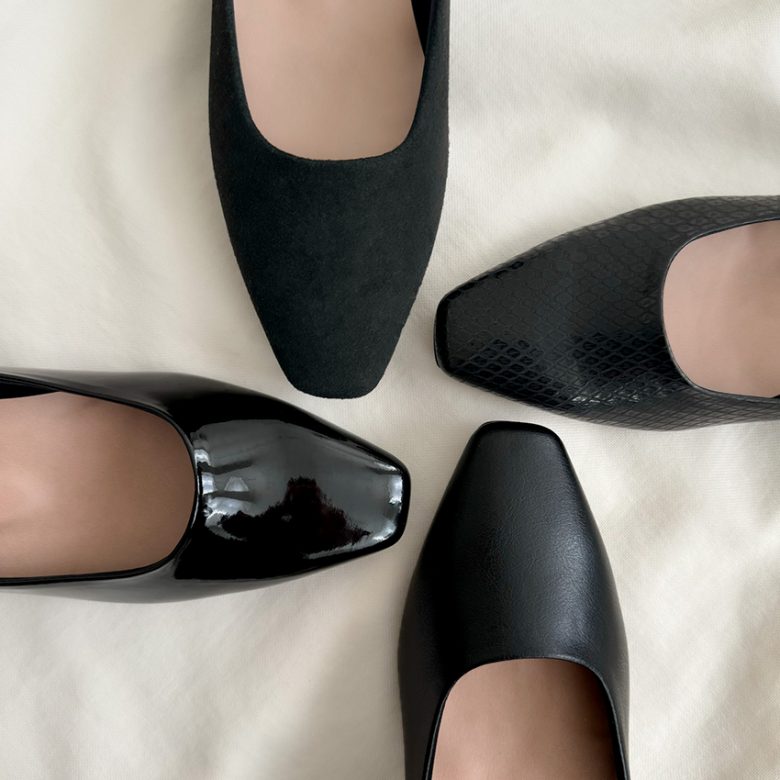 日常のあらゆるシーンにあわせて選べる4素材のブラックに、カジュアルからきれいめまで幅広いコーデの足元に活躍するフラット、3cmヒールをご用意しました。