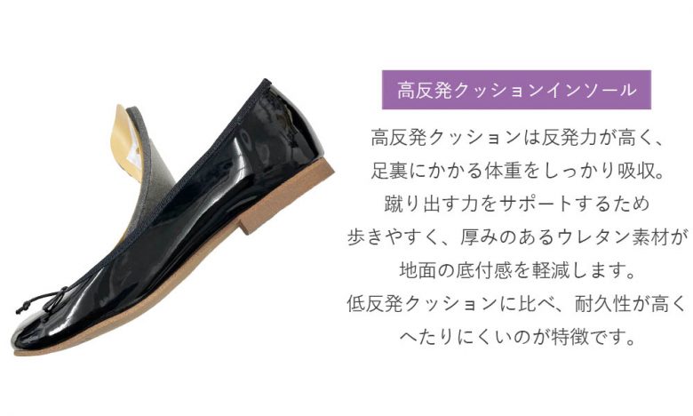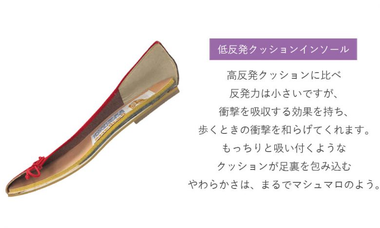 ファルファーレのバレエシューズには、2013年の発売以来長らく好評いただいている低反発クッションインソールに加え、2022年以降発売のリニューアルアイテムや新作アイテムには高反発クッションインソールを使用しています。