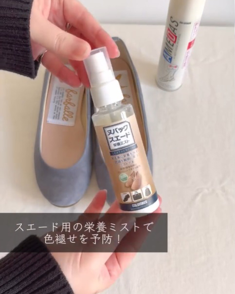 ②色褪せを予防のために、スエード用の栄養ミストを満遍なく振ります。振ったあとは風通しのいいところで十分に乾かして。
