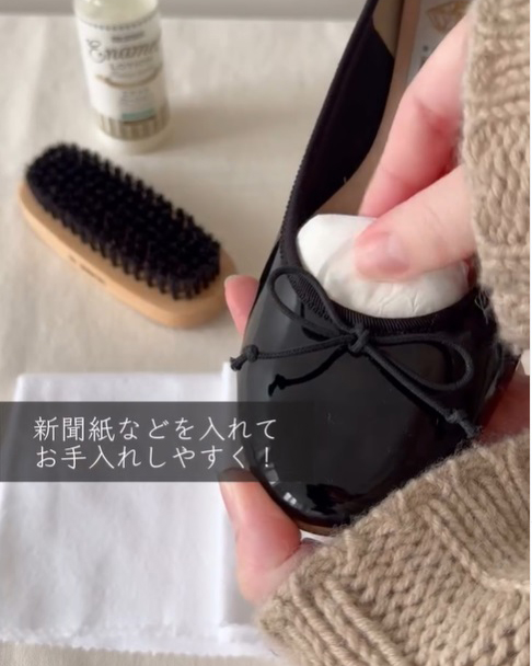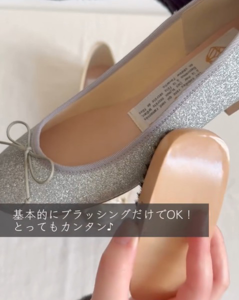 ラメのついたブラシでエナメルシューズのケアをすると、エナメルにラメが貼り付いて剥がれなくなるのでご注意!