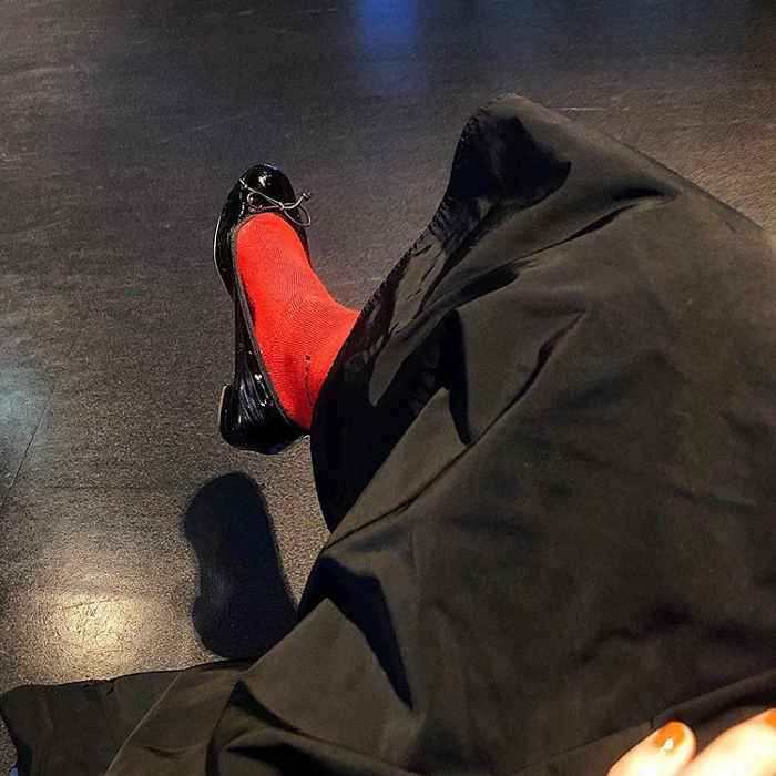 そこそこ王道、黒バレエシューズに赤ソックス。