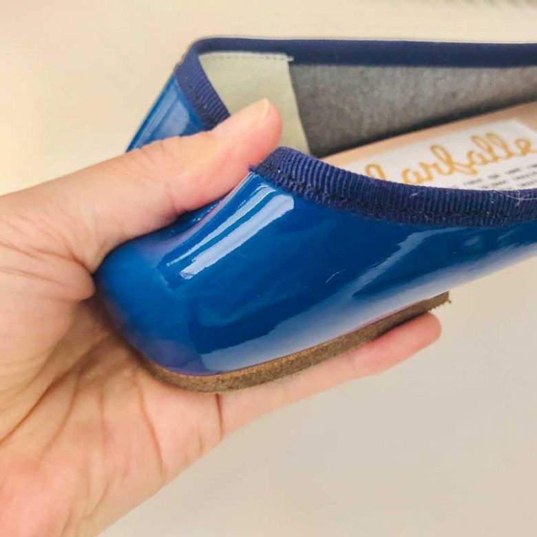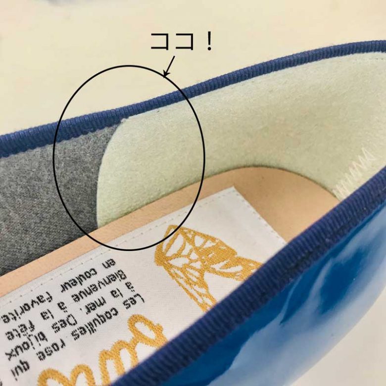 だから、足入れの心地よさにとことんこだわったエナメルバレエのかかと部分はこんなに柔らかく仕上っています。