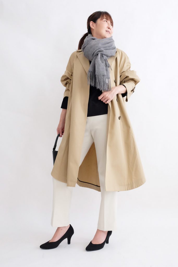 トレンチコートの持つ正装感でゆったりコーデがだらしない印象になりません。