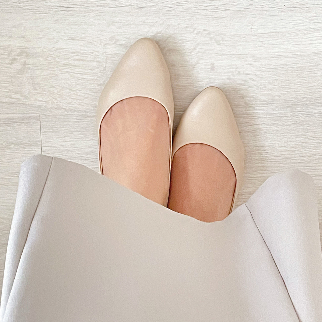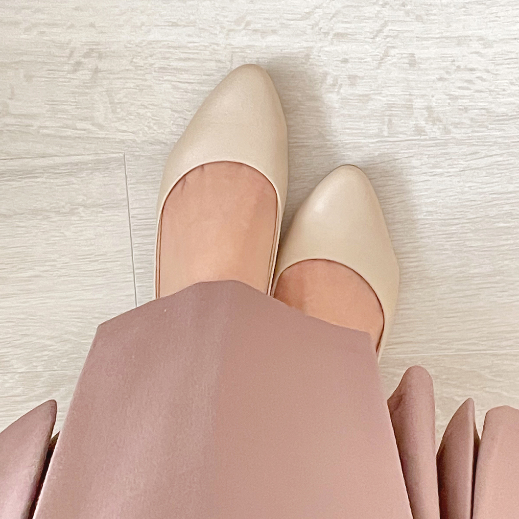 パンプスはスカートとバッグの色に合わせてベージュのヒール有りタイプをチョイスしてみました。