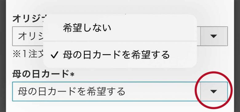 ②母の日カード欄の「▼」マークをタップして、「母の日カードを希望する」を選択してください。