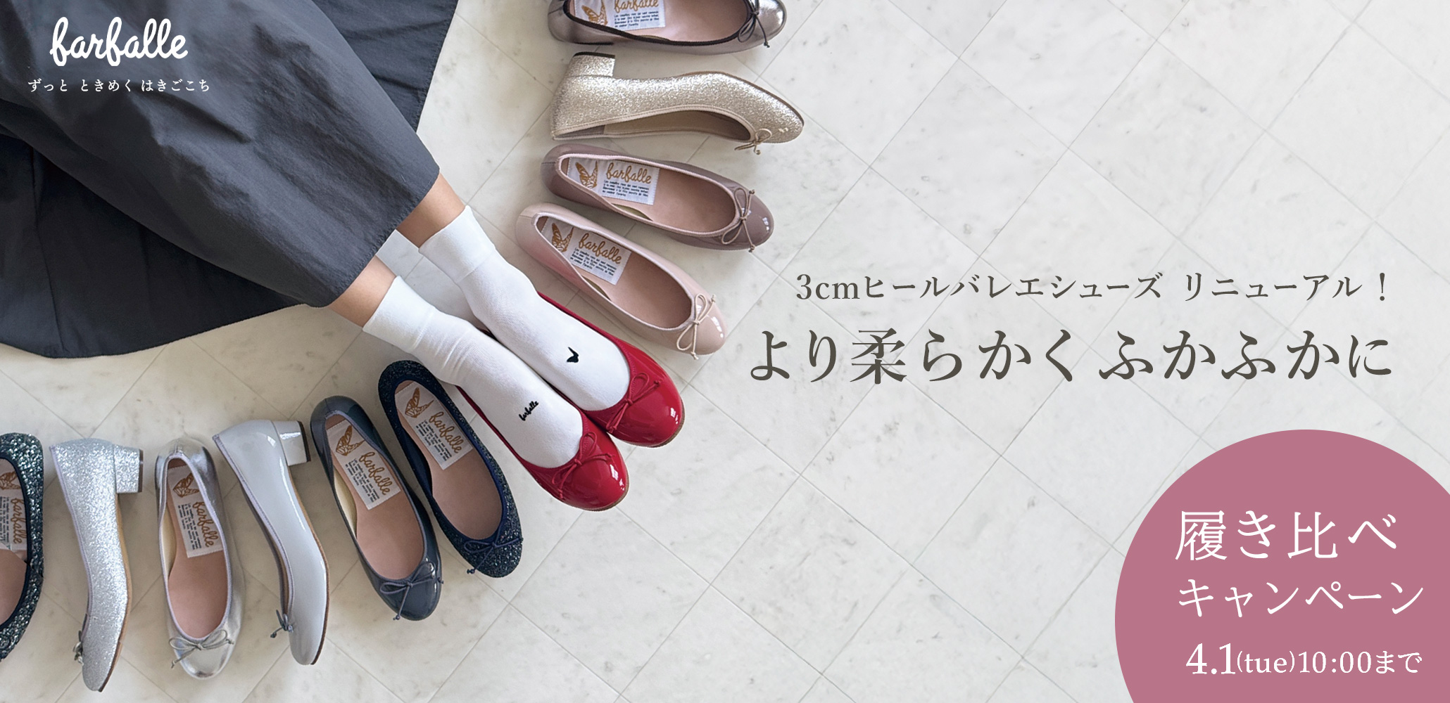 ファルファーレのアイコンアイテム「バレエ(エナメル)」のミドルヒールタイプ、「3cmヒールバレエ」シリーズがより柔らかく、ここちよい履き心地にリニューアルしました!