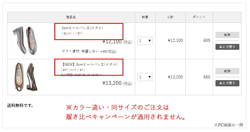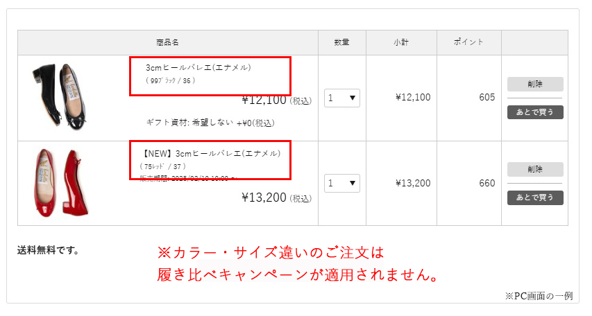 異なるカラー・サイズ違いで「3cmヒールバレエシリーズ」と「【NEW】3cmヒールバレエシリーズ」を1足ずつ購入された場合は、履き比べキャンペーン適用外となり、返送料がお客さまのご負担になりますのでご注意ください。