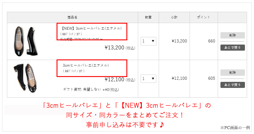 同カラー・同サイズの3cmヒールバレエシリーズと、【NEW】3cmヒールバレエシリーズをまとめてご注文してください。事前お申し込みは不要です♪
