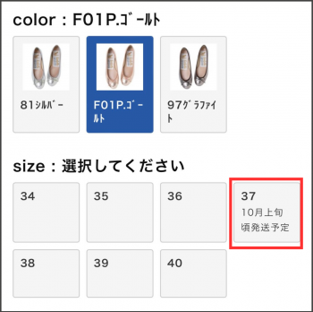 各商品ページでカラーを選択して、以下の箇所に発送予定日が記載されているものがご予約の対象となります。