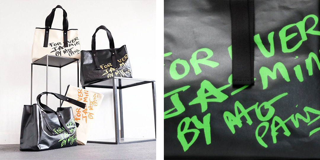パリのアーティスト「NACO PARIS(ナコパリ)」によるドローイングが、ストリートカジュアルな雰囲気のA面。コーティングした素材がちょっぴりハードな質感。