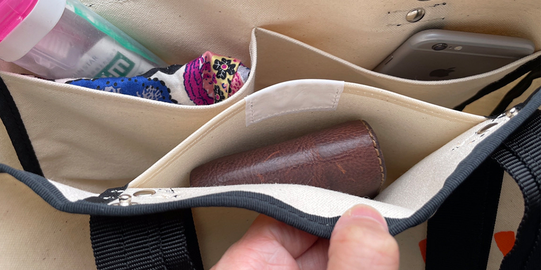 トートバッグの上部には2つのスナップボタンがついていて、ぴたりと閉じることができるこのトート、