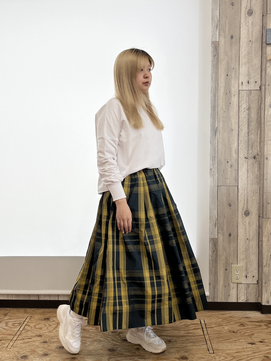 スタイリングするアイテムによって表情が変わるイエローチェックスカートは大活躍間違いなし◎