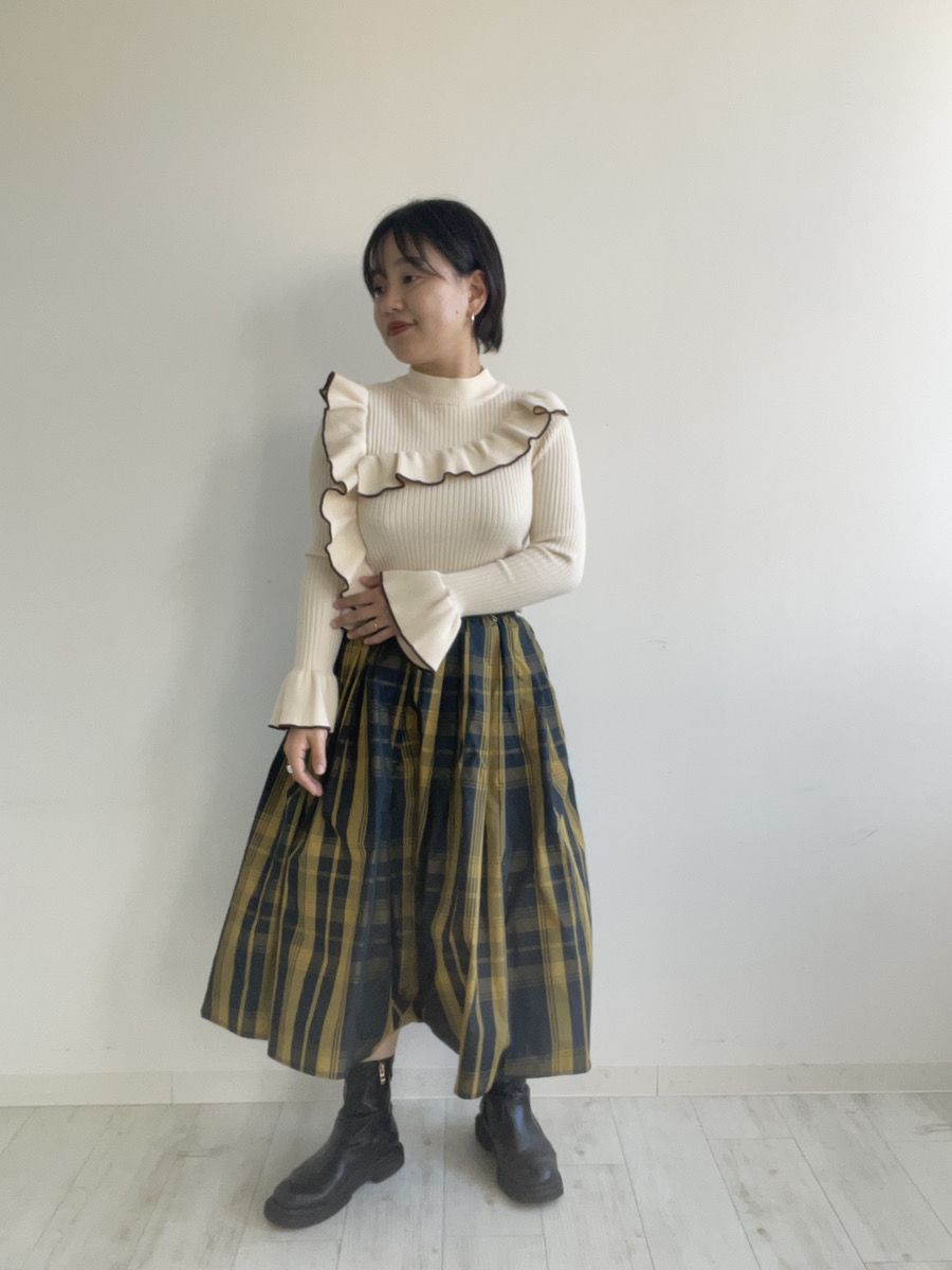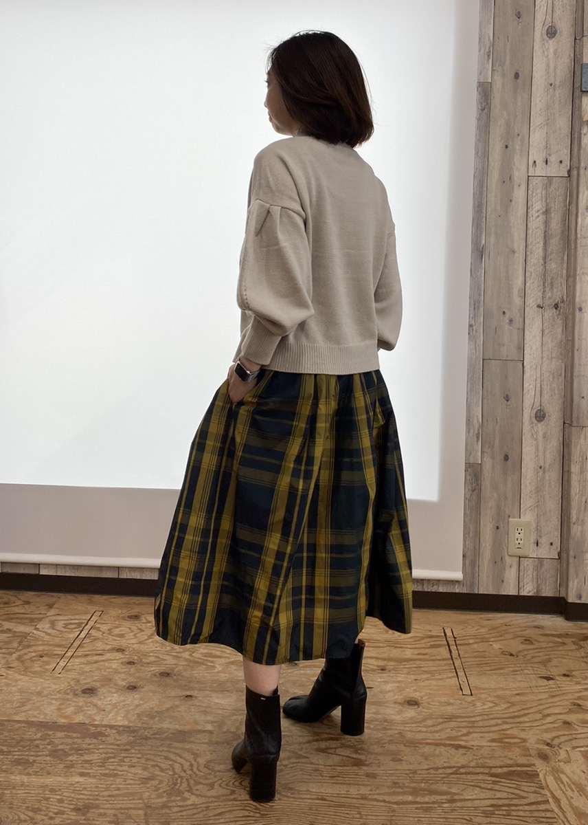 アイボリーのニットはスモーキーイエローとダークグリーンのチェックスカートと相性抜群◎