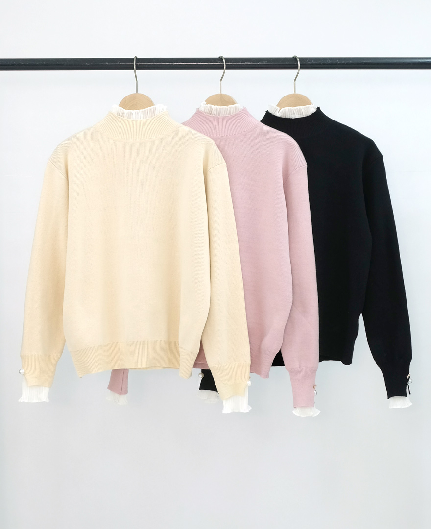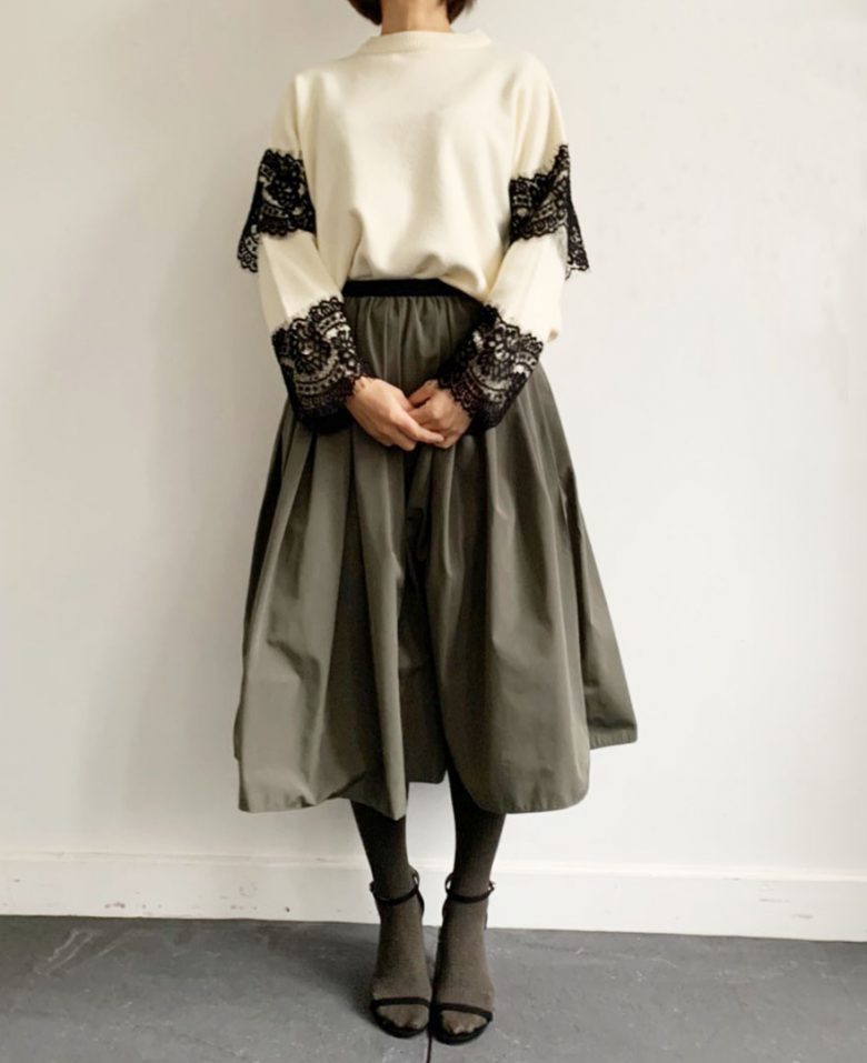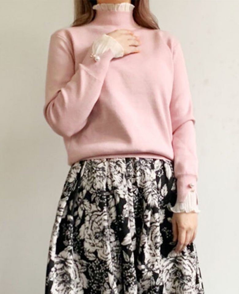ハイネックからちょっとだけ覗くフリルレースが顔周りを華やかに演出してくれます。
