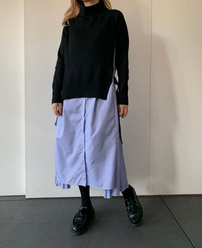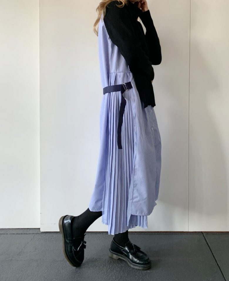 サイドにプリーツが入っているので、縦のラインを強調しロング丈でもすっきりした印象に。