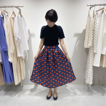 スカートと合わせているパフスリーブニットは、完売と再入荷を繰り返している人気アイテムです!