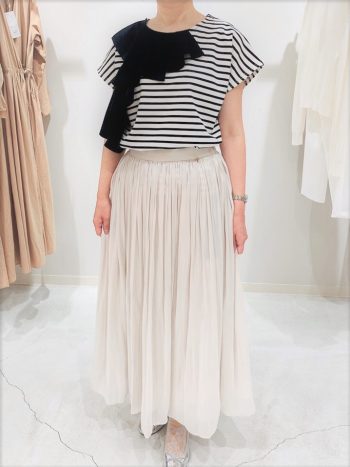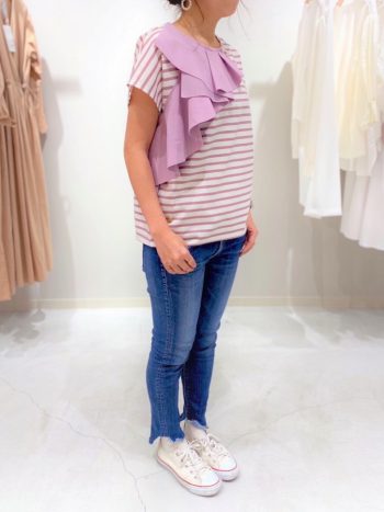 今回ご紹介した「フリルドレープ半袖カットソー ボーダー」の