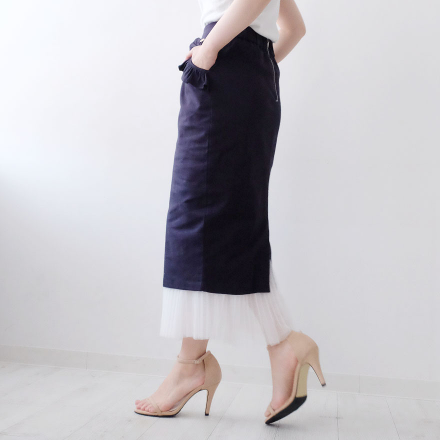 タイトシルエットでも程よくゆとりがあり、ラインを拾いにくい、大人可愛いロングスカート。