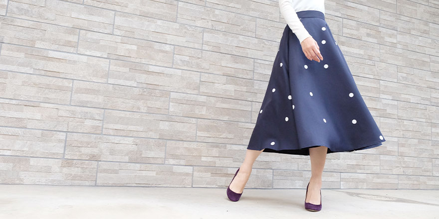 ウエストにあえてタックを入れず、生地を斜めにとって落ち感のあるAラインシルエットに仕上げました。