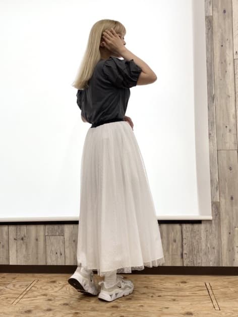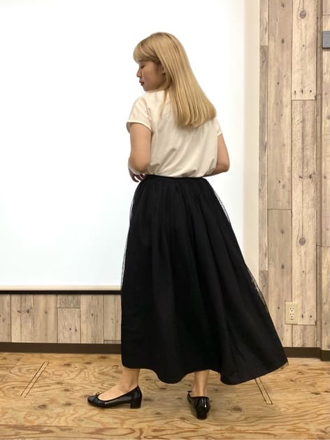 チュールを重ねたことでボリュームを抑えたデザインになっているので、トップスをインしないコーディネートあわせも可愛くきていただけますよ。