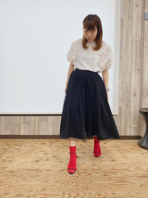 チュールスカートが足元を涼し気な印象にしてくれるので、靴下合わせでも軽やかな印象に◎