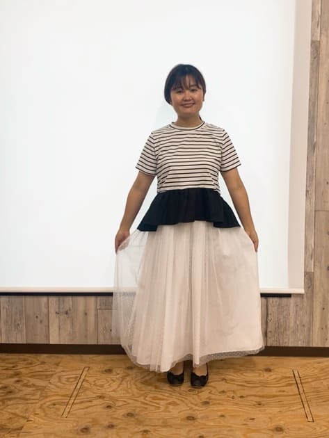 ウエストから広がりのあるトップスにチュールスカートを合わせて、ワンピース風に着こなしてみました。
