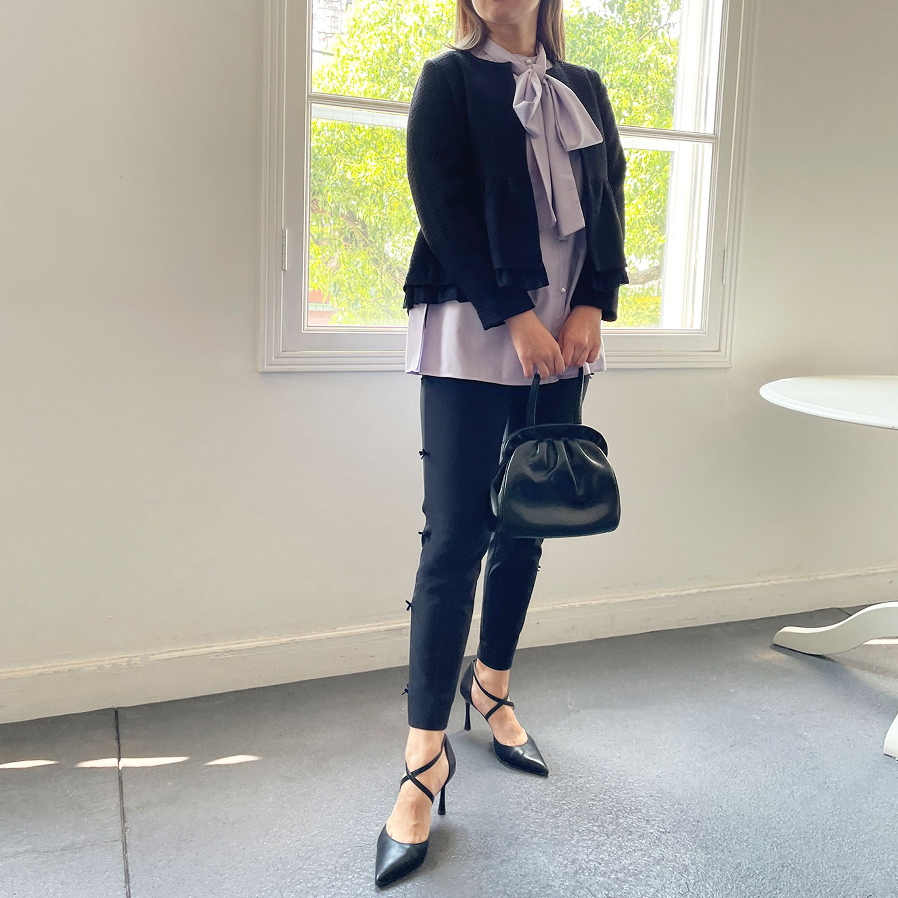 ボウタイブラウス×ツイードジャケットはフォーマルスタイルの王道コーデ。
