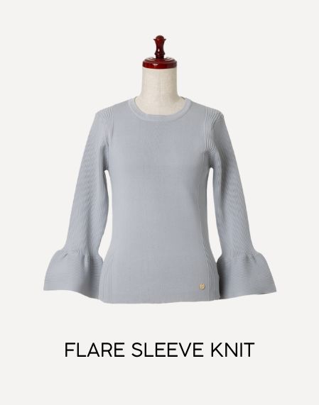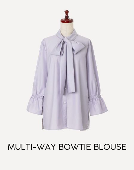 袖元のゴムとフレアシルエットが特徴のマルチWAYボウタイブラウスはジャケットなしでもきちんと感のある印象に。