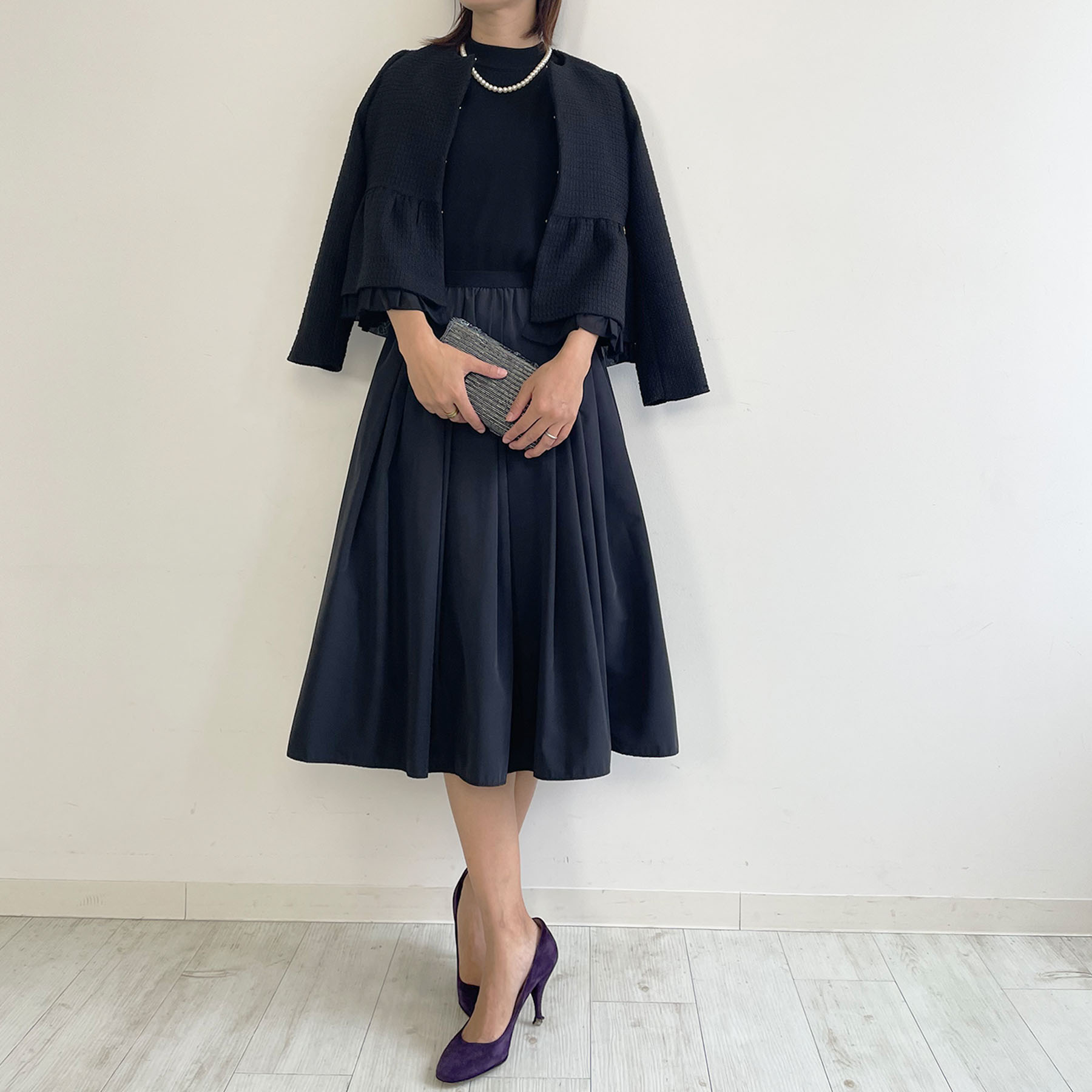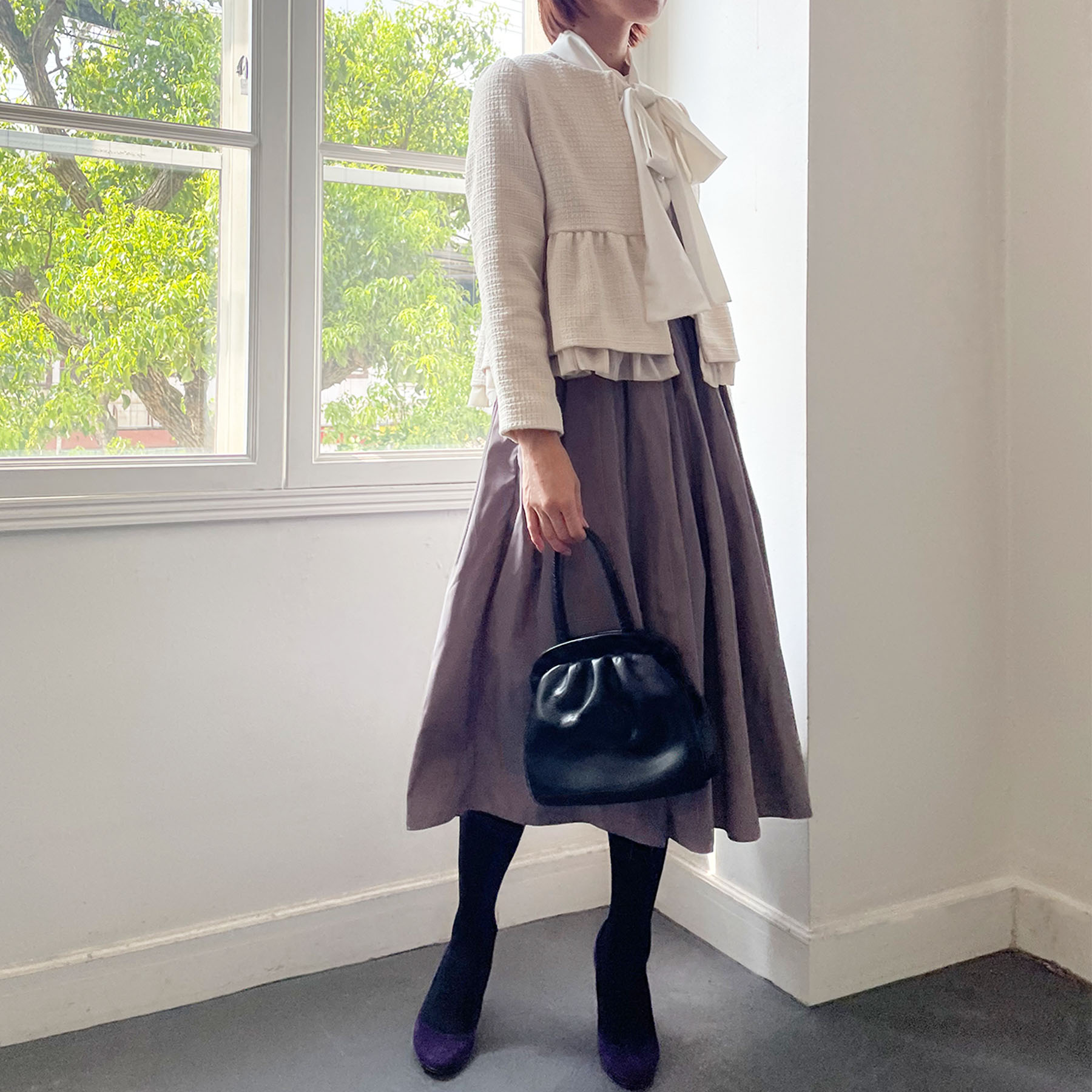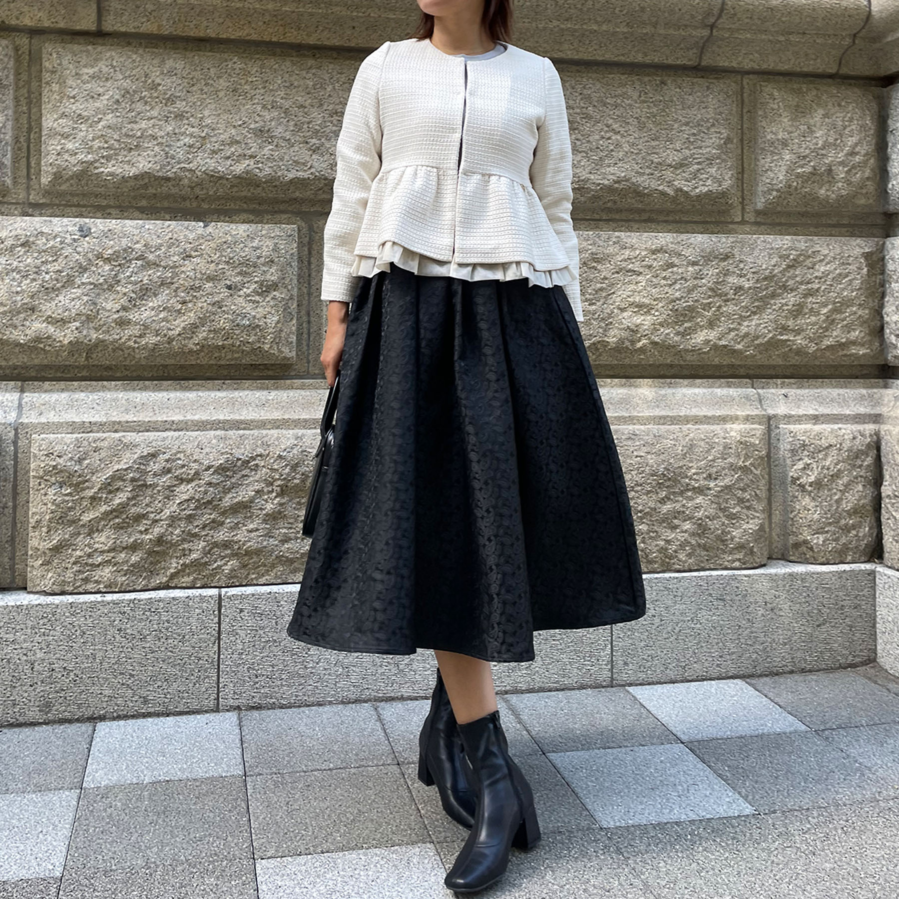 長すぎない着丈とペプラムデザインが魅力のジャケットは神戸・山の手スカートとも相性抜群◎