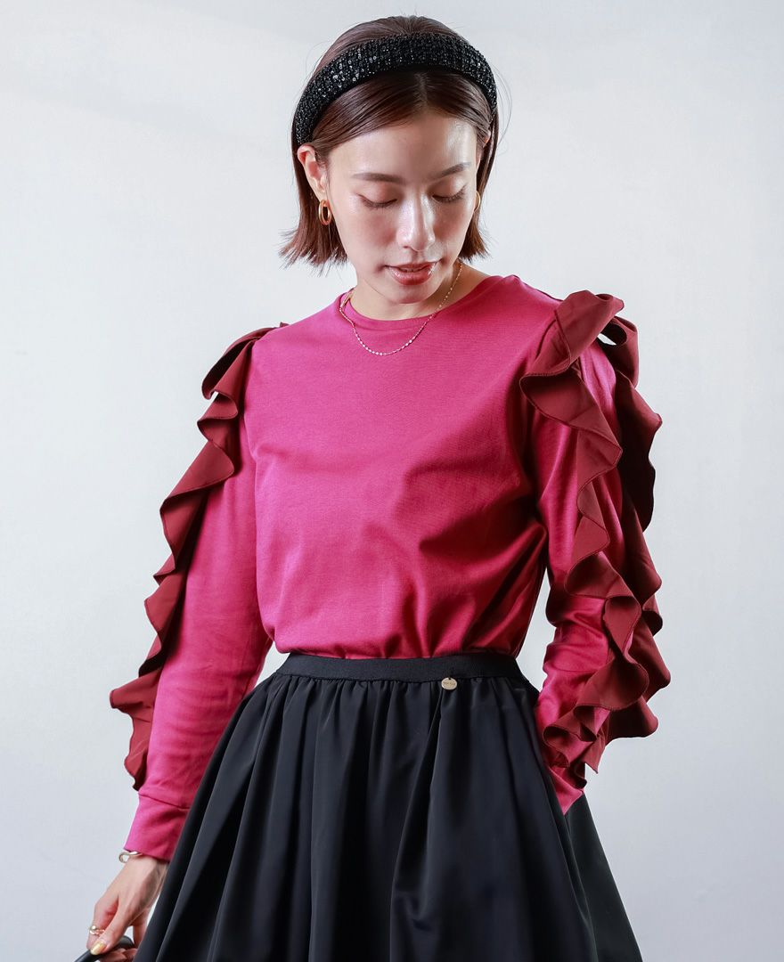 トップス:裾フリルドッキングプルオーバー/ブラック