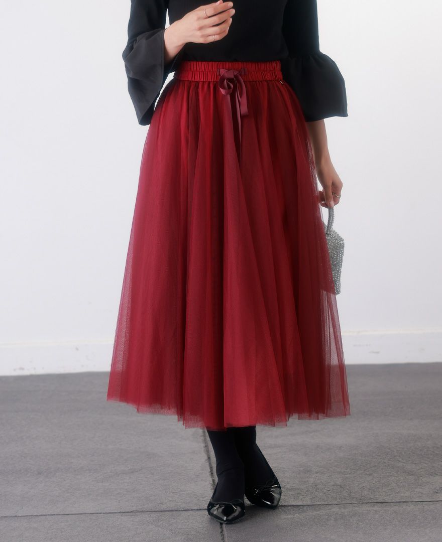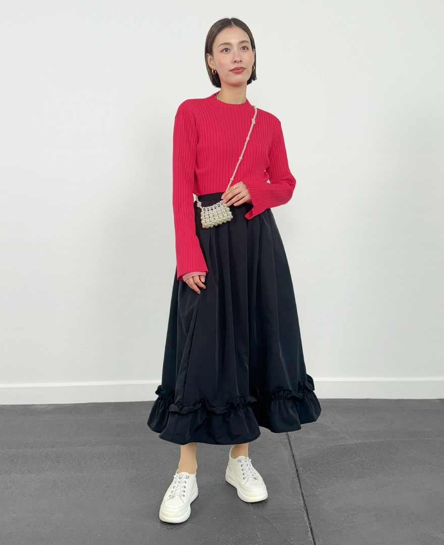 ワインレッドのスカートは、深みのある色合いでコーデを一気に秋らしくアップデート。