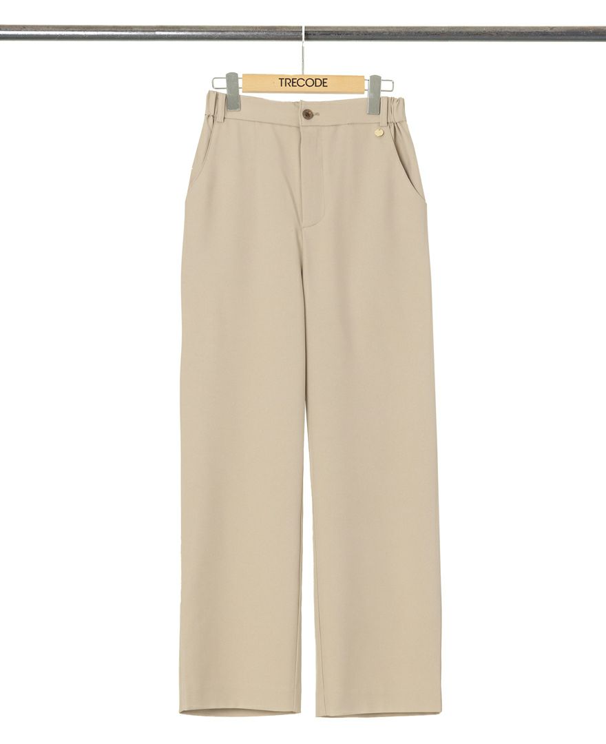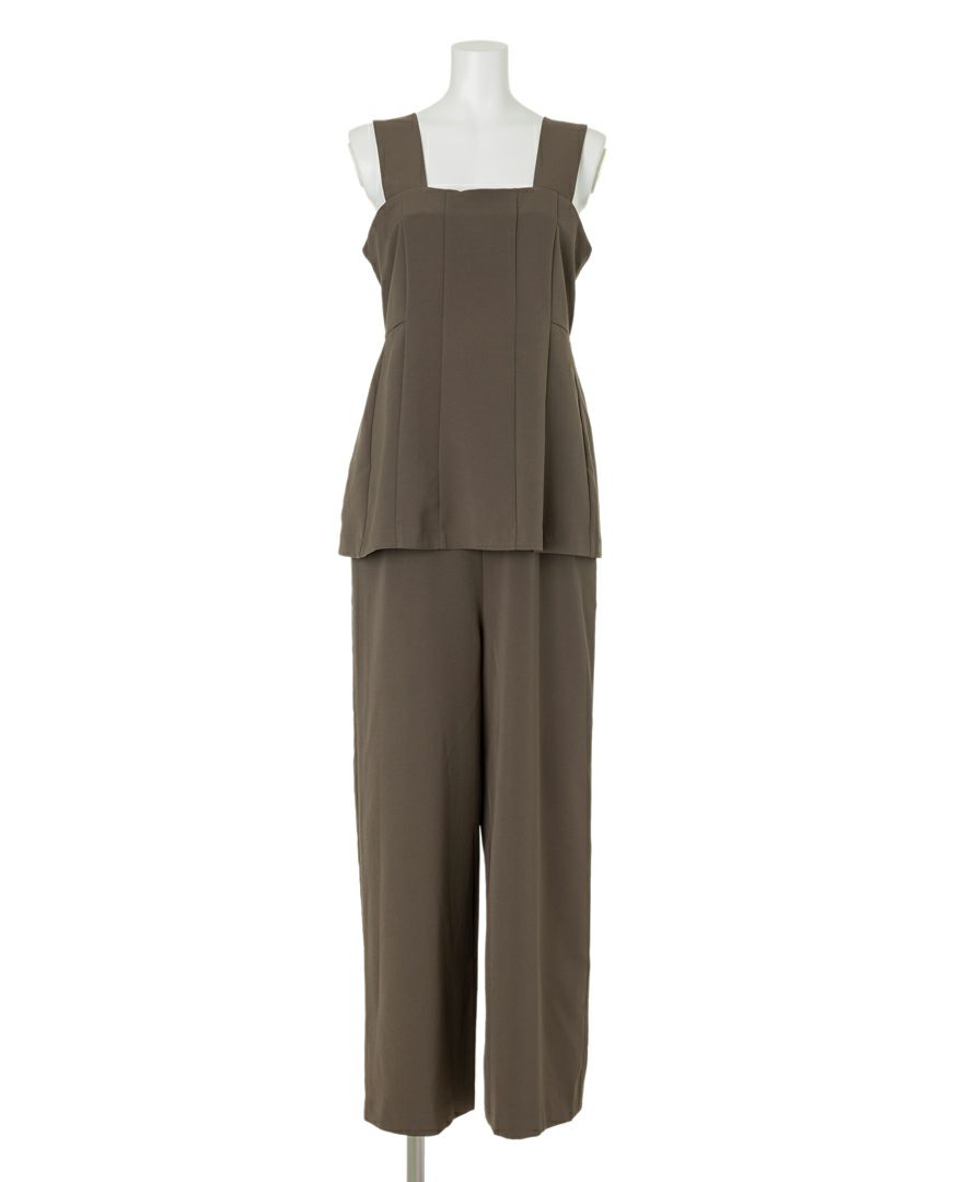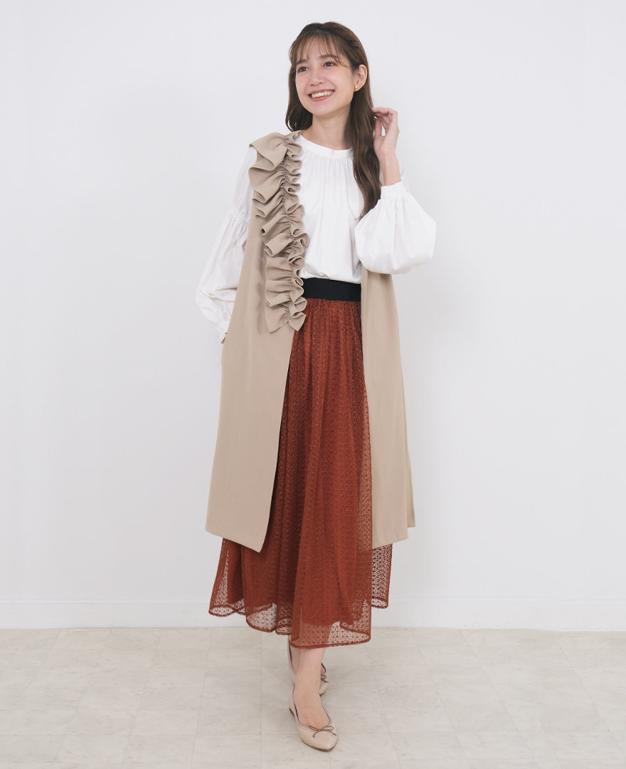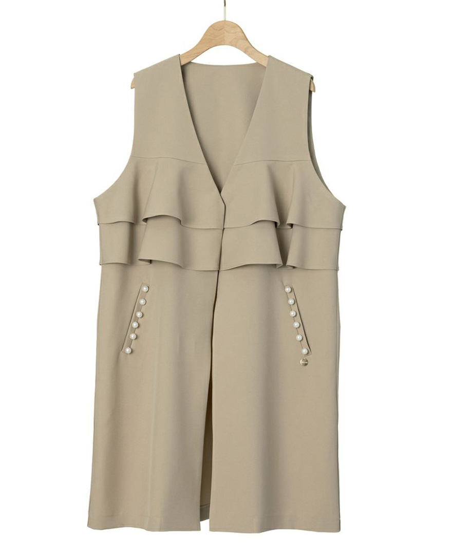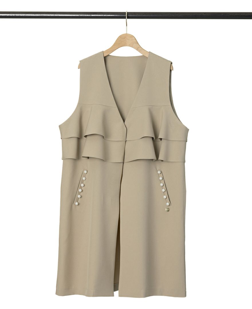 フリルとパールデザインが華やかさを引き立てるジレと、着回しの効くきれいなシルエットのパンツです。