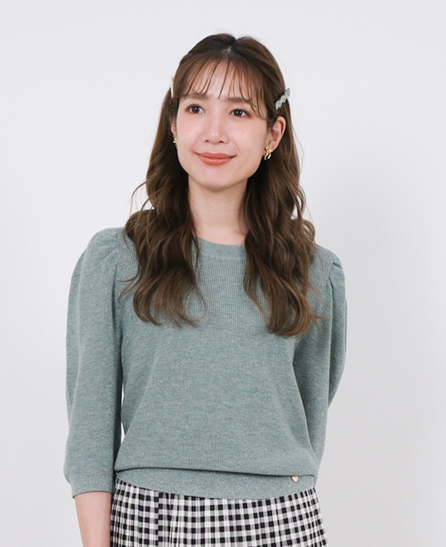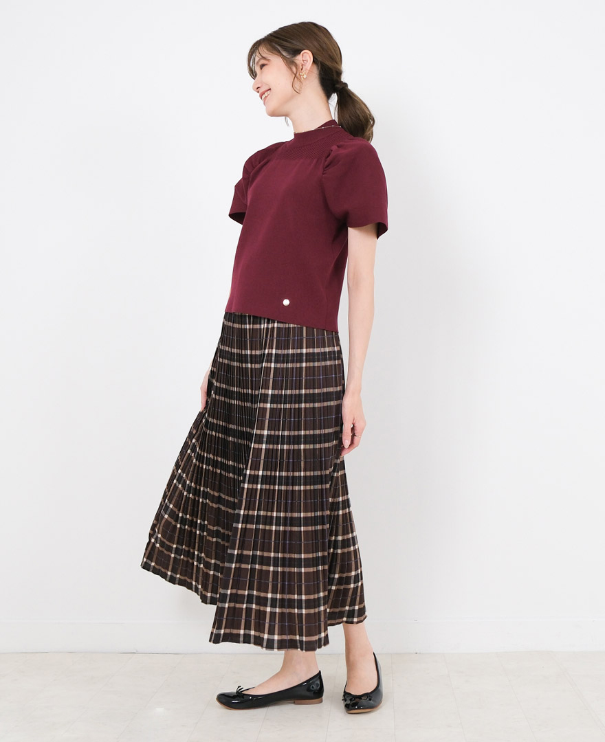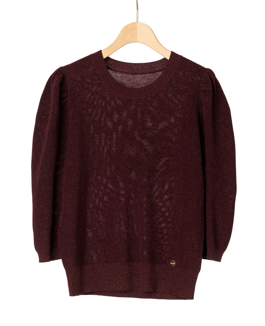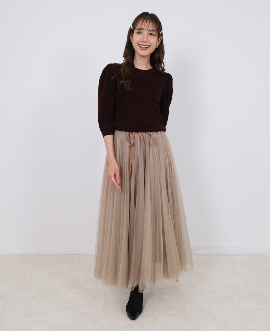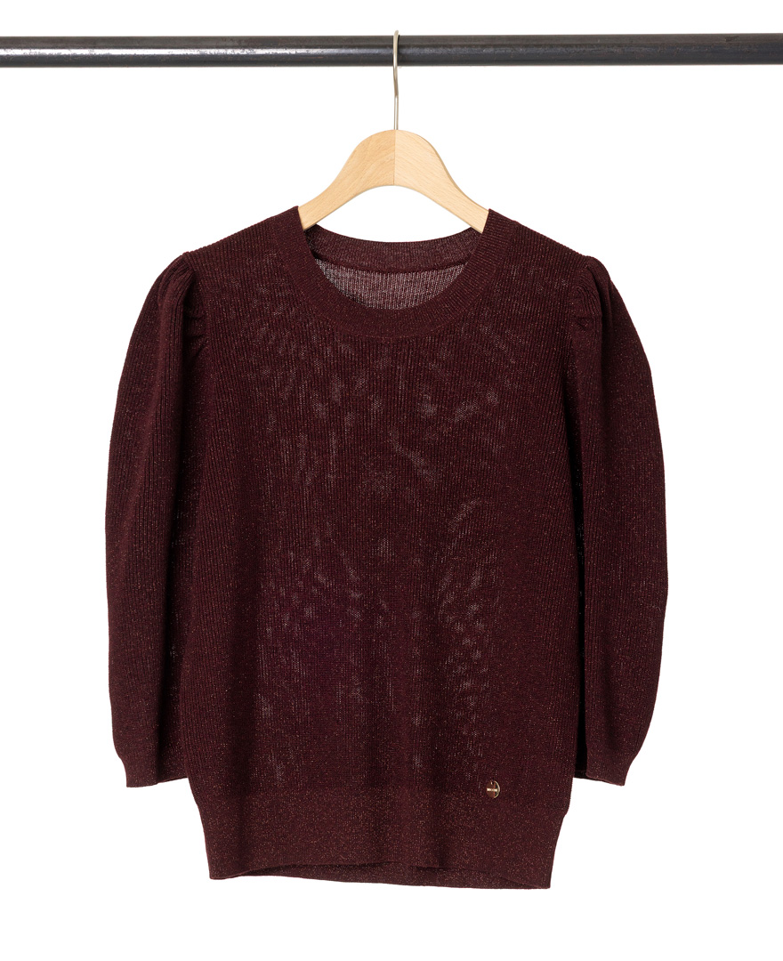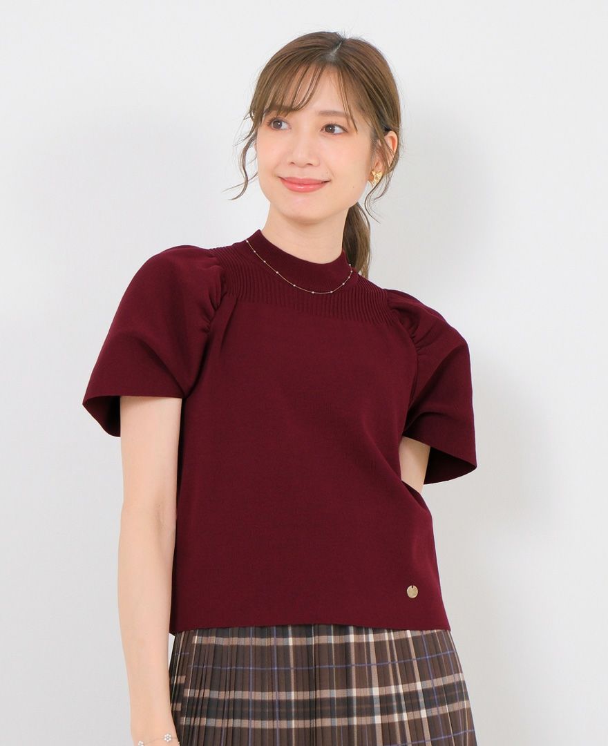 トップス:パフスリーブニット/ワインレッド