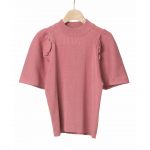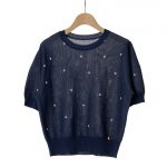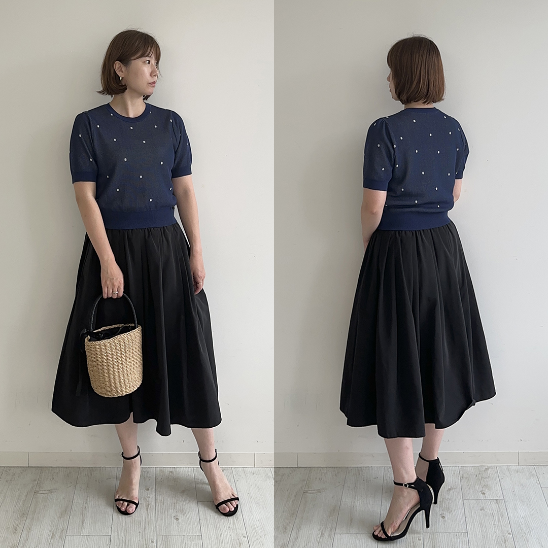 スカートにも合うように、あえてコンパクトな丈感にしアウトしてもスッキリ見えするドット柄サマーニット。