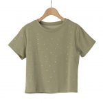 トレンドのラインストーンTシャツを合わせた旬コーデ。