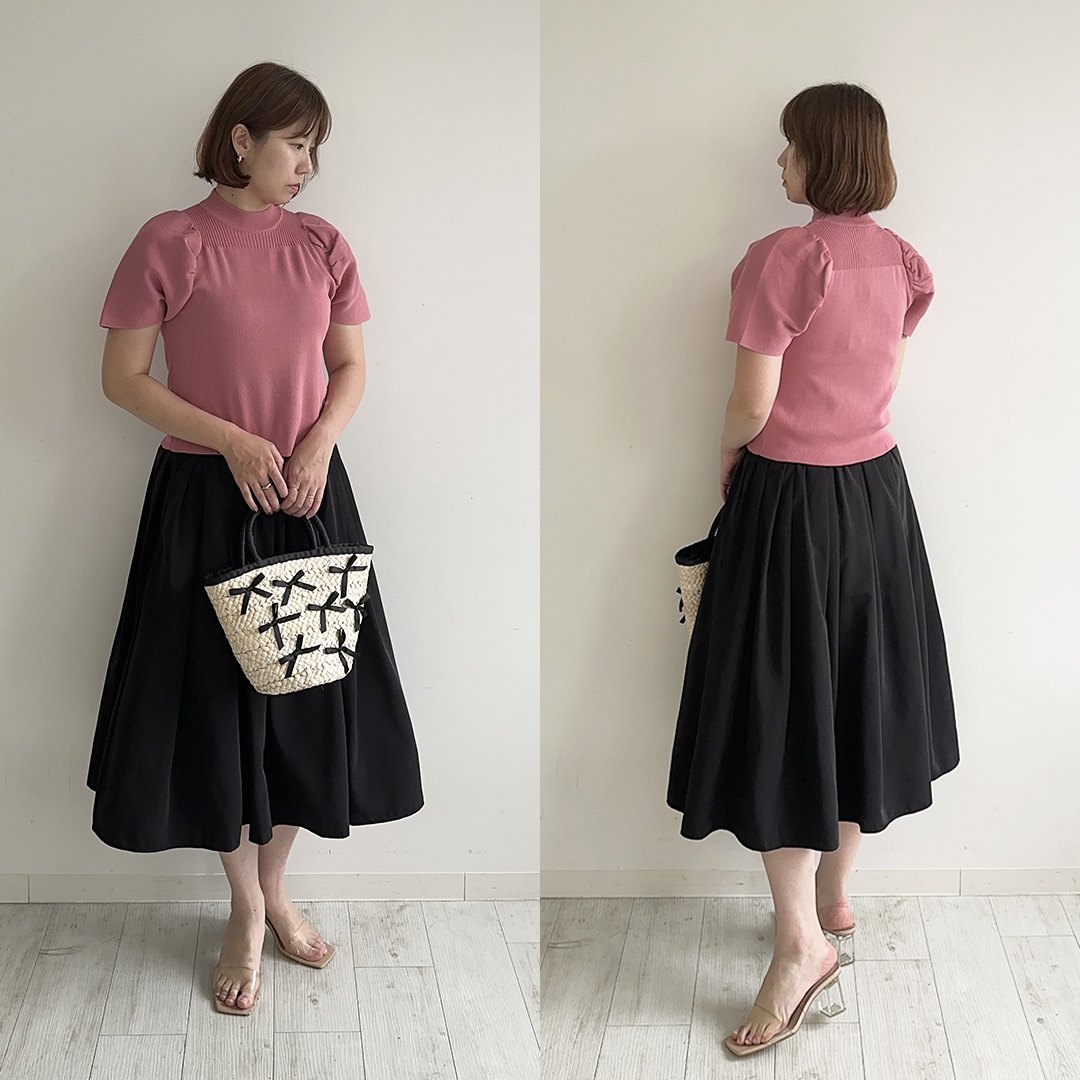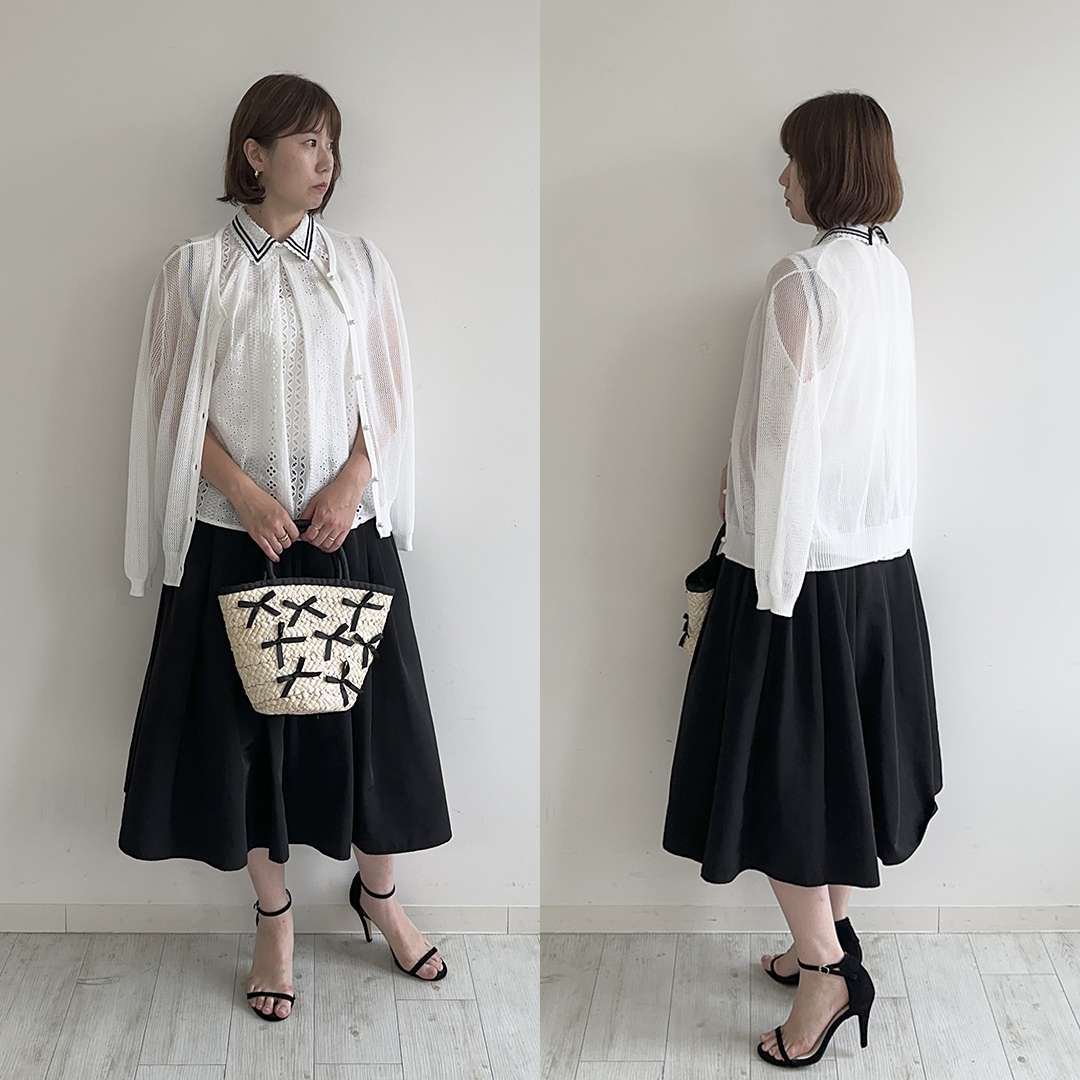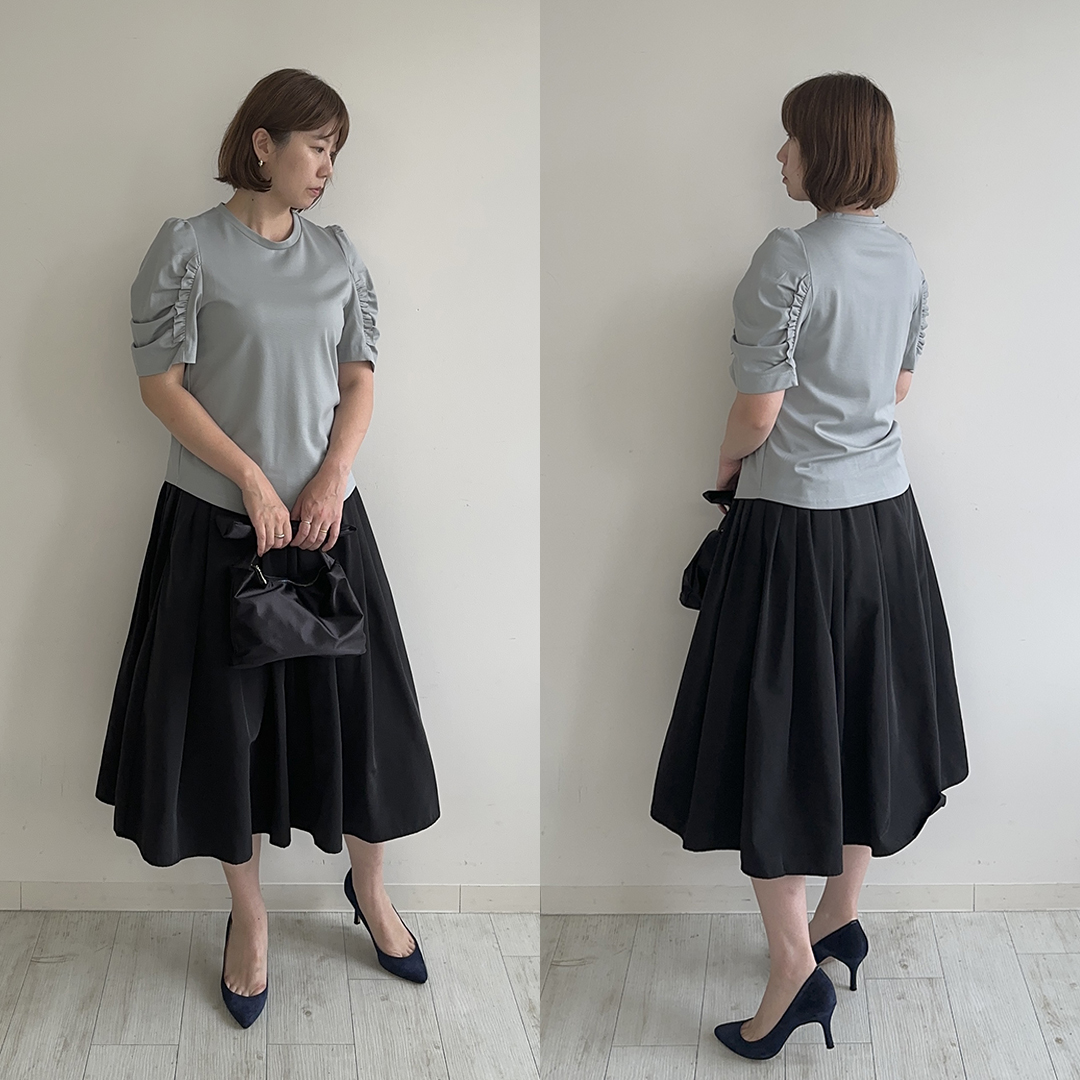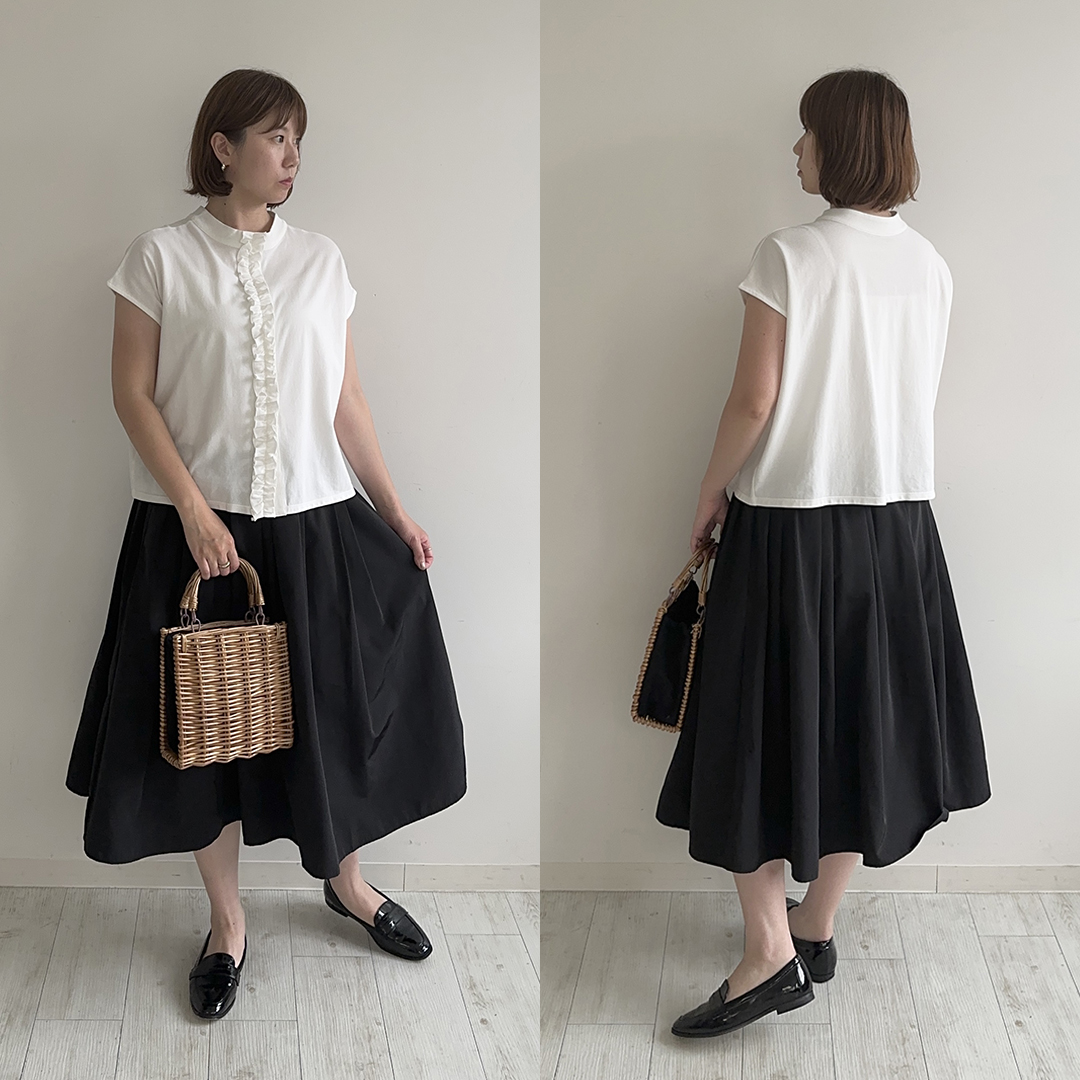 そこで今回は、神戸・山の手スカートの一番人気アイテムの【ブラックカラー】と合わせた、おすすめの「インしない」コーデをご紹介♪