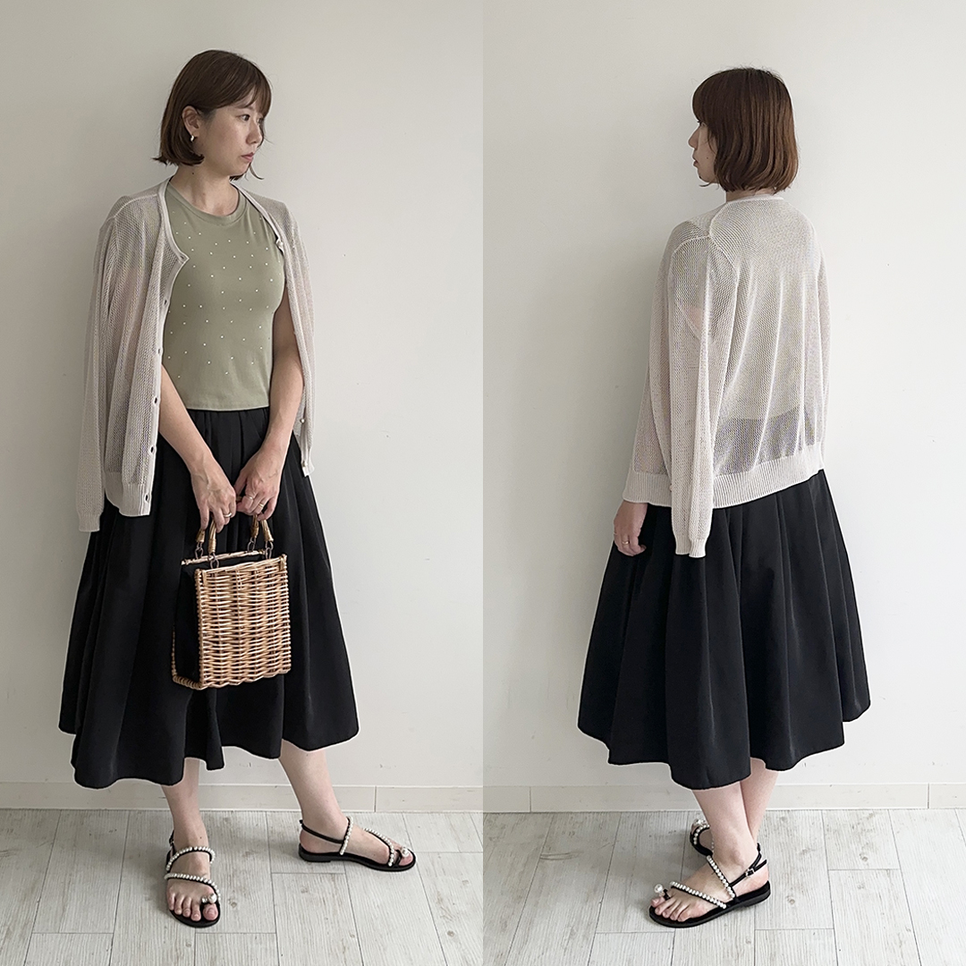 Tシャツを着た時の気になる二の腕も、メッシュカーディガンを合わせてオシャレにさりげなくカバー。