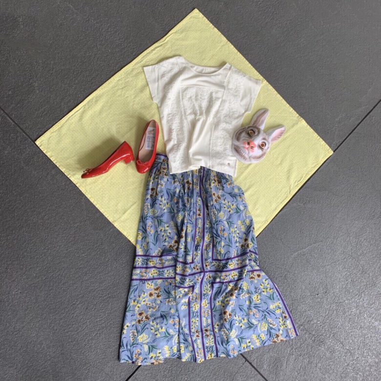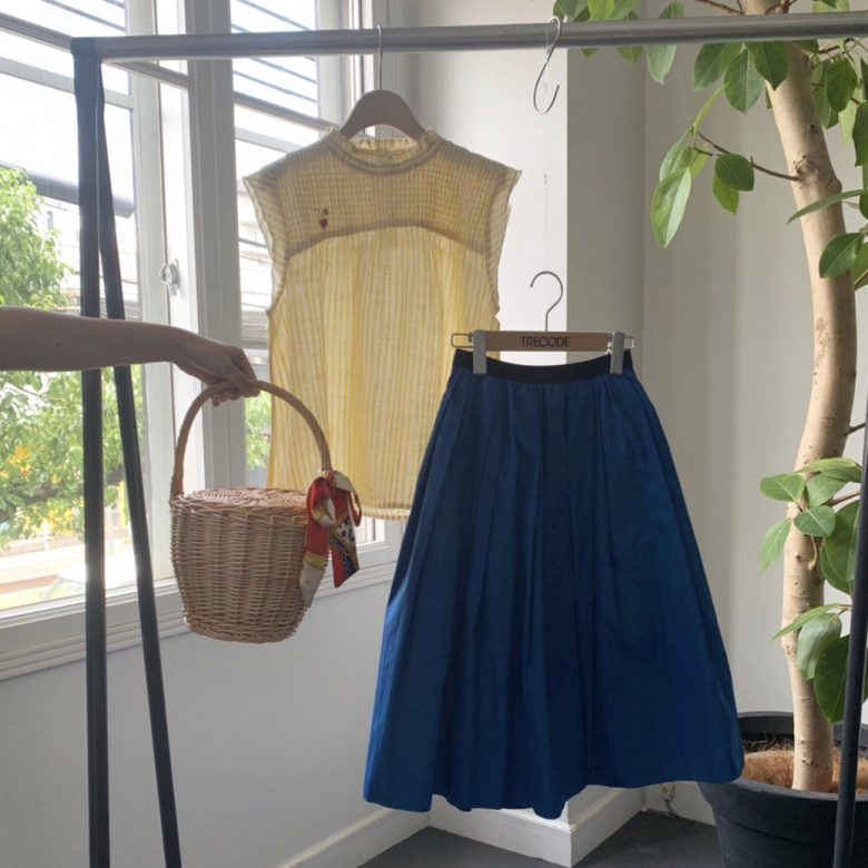 いつもよりちょっと冒険したブルーのスカートに、ちび襟と袖がフリルになってかわいらしい
