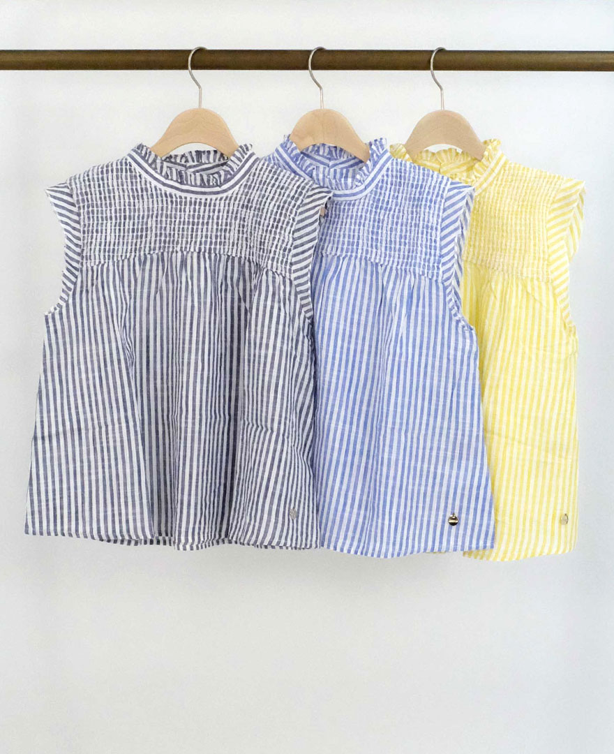 【再マークダウン30%オフ】ストライプ先染めコットンスラブシャーリング肩フリルブラウス